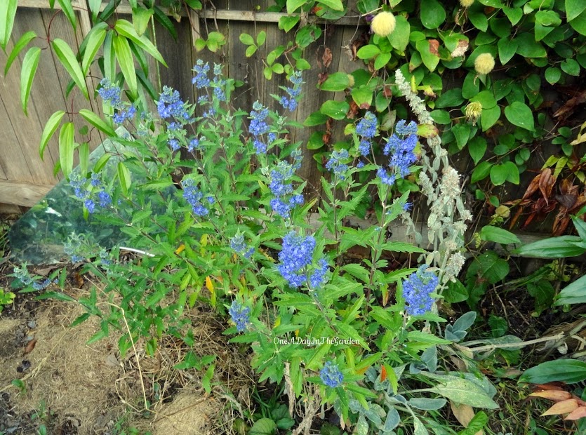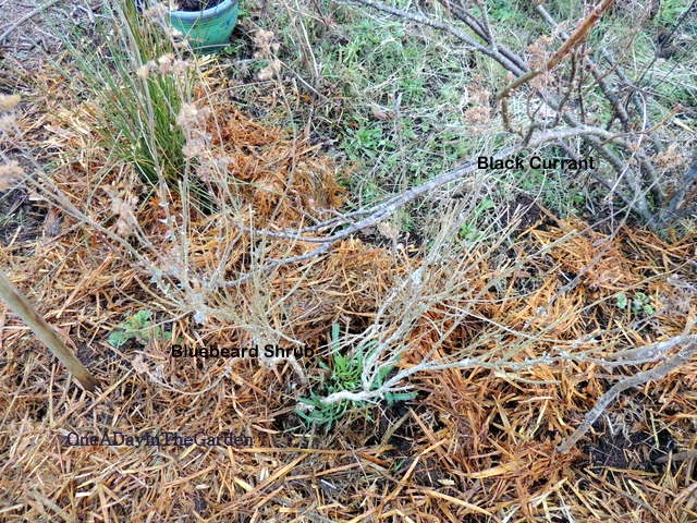 labeled. Bluebeard shrub, black currant (gets cut